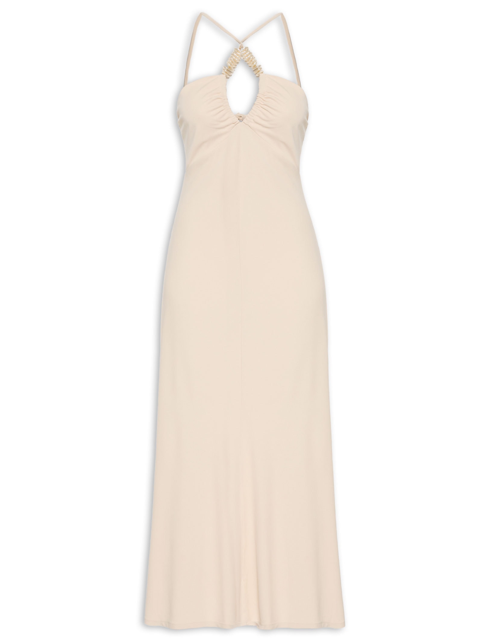 O vestido bege é confeccionado em malha leve sem elasticidade. A peça de justa ao corpo possui decote halter com recorte vazado, alças finas com miçangas e ajuste posterior por amarração, comprimento midi e fechamento posterior por zíper invisível.