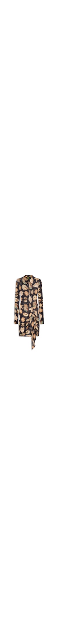 O vestido preto é confeccionado em tule de média elasticidade. A peça justa ao busto e solta no comprimento curto possui gola esporte co recorte aberto em V com amarração frontal ajustável, mangas longas ajustadas, estampa em cores contrastantes, drapeado lateral com faixa alongada aplicada, caimento ajustado ao corpo, barra assimétrica e acabamento pespontado. Não possui forro e não apresenta fechamento.